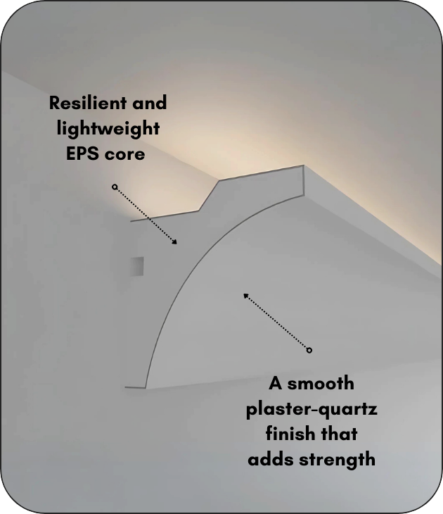 Achieve a professional, lasting finish with our premium plaster-coated coving. Its durable EPS core ensures easy installation while resisting cracks, water, and UV damage for superior performance in any space.